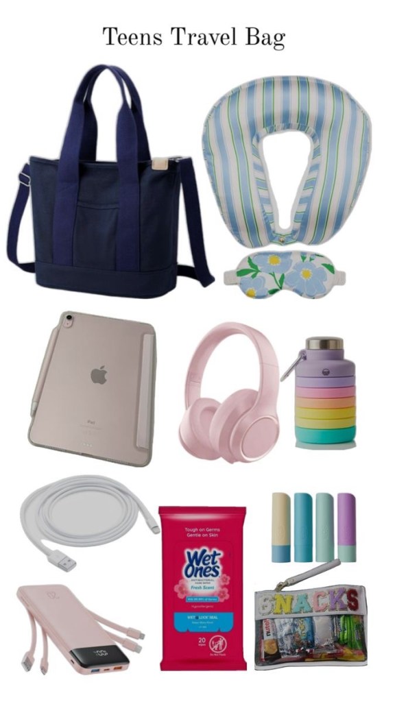 Her bag is very similar to mine but with a lot less. iPad with pencil, head phones, chargers, neck pillow, wet ones, empty water bottle, chapstick, and snacks. My goal with hers is for her to be self sufficient and need nothing from me.
